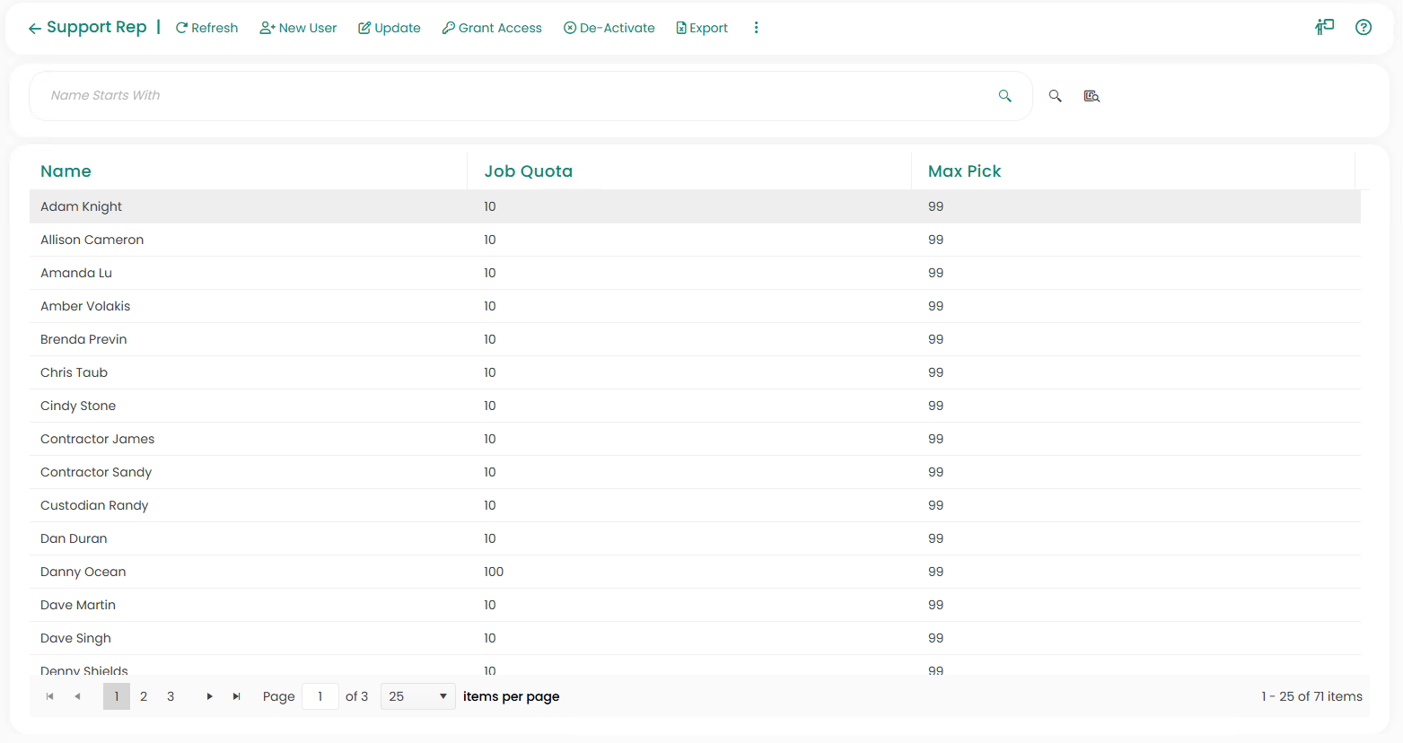 When this window is first opened, a list will be populated with all Support Reps that currently exist in ServicePRO. However, you can enter in search criteria to narrow down the listing to Users you wish to view. Each Support Rep’s name, job quota and max pick values will be listed. At the bottom left hand corner, a count of how many users have been listed is displayed.