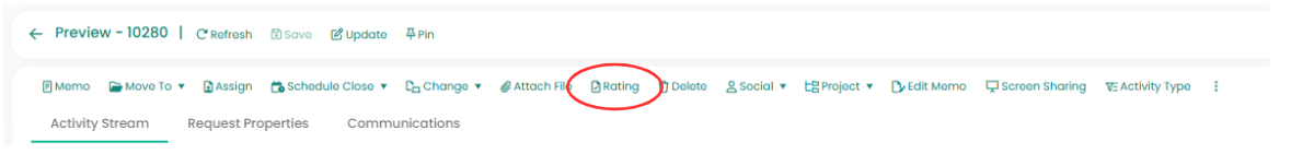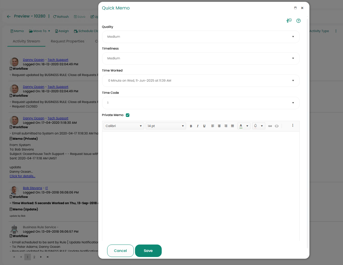 - Quality – Using the drop down menu, rate the degree of quality of the service received on this request. Options include Low, Medium, High and Excellent.