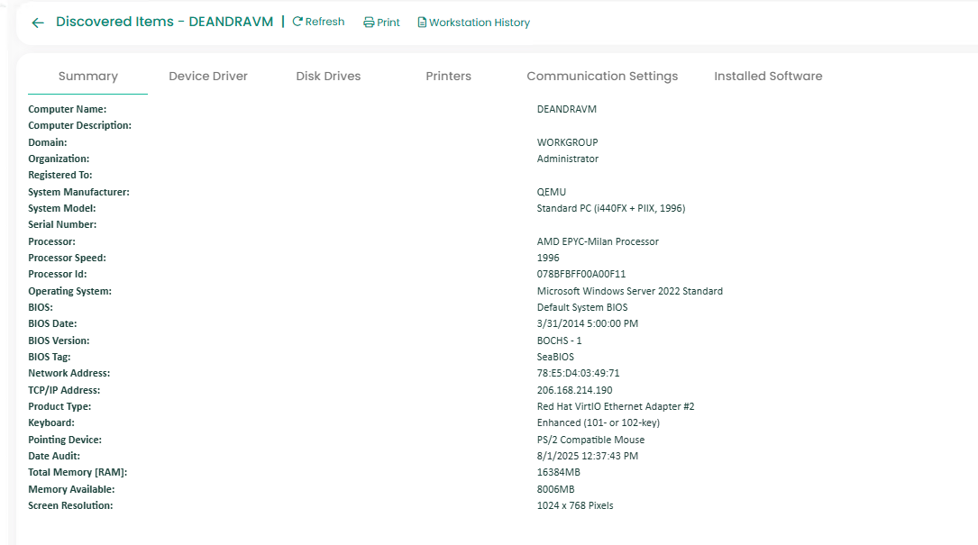 9. Followed by that, it will automatically navigate to the Discovered Items Properties page in the ServicePRO application on your browser to display the properties of your workstation that just got audited.