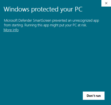 5. On the Microsoft Defender Security Prompt, please click on the "More Info" link. It will then show the option to "Run Anyway". Click on the "Run anyway" button.