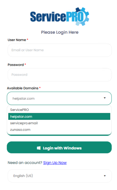 Select the Server Domain for ServicePRO. This option can be enabled or disabled by the Administrator in the ServicePRO Portal. For More information please see Active Directory Authentication