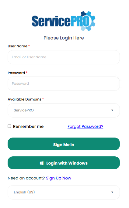 Log into ServicePRO with your login credentials.Users may use their Email or Username to access ServicePRO.
