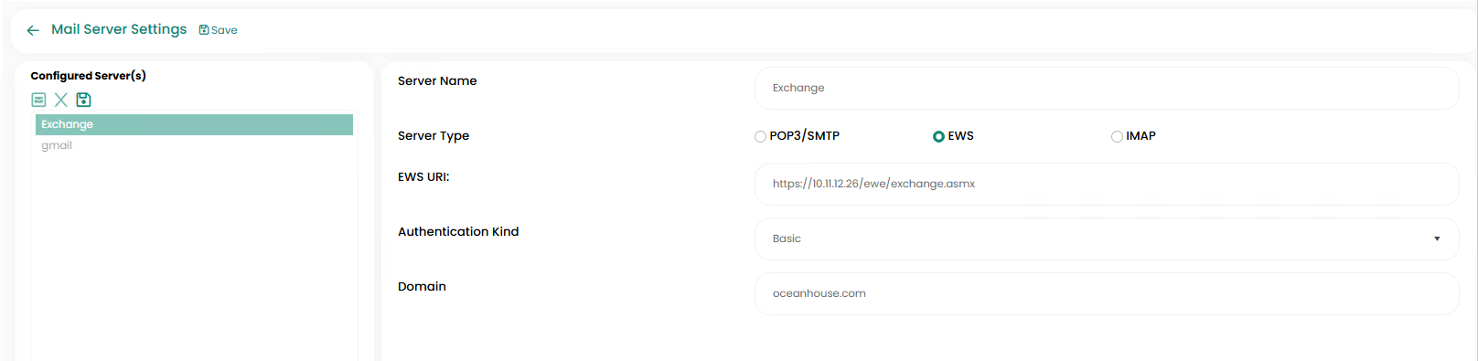 - Click on the Save icon just above the Configure Server(s) list to save the changes for each specific email server you configure.