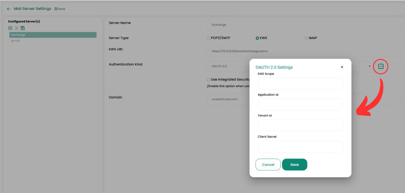 When ‘OAuth 2.0’ is selected for Authentication Kind, please make sure to click on the ellipsis button next to the field and enter the EWS Scope, EWS Application Id, EWS Tenant Id and EWS Client Secret key in the dialog that opens up. Note: The settings that are required for OAuth 2.0 Authentication in User Mail Server setup have been moved from the Configuration Files to the ServicePRO Application User Interface, from version 14.2.22.x on-wards. So, whenever the Client Secret Key expires, please take care of updating the same from the User Mail Server setting window.