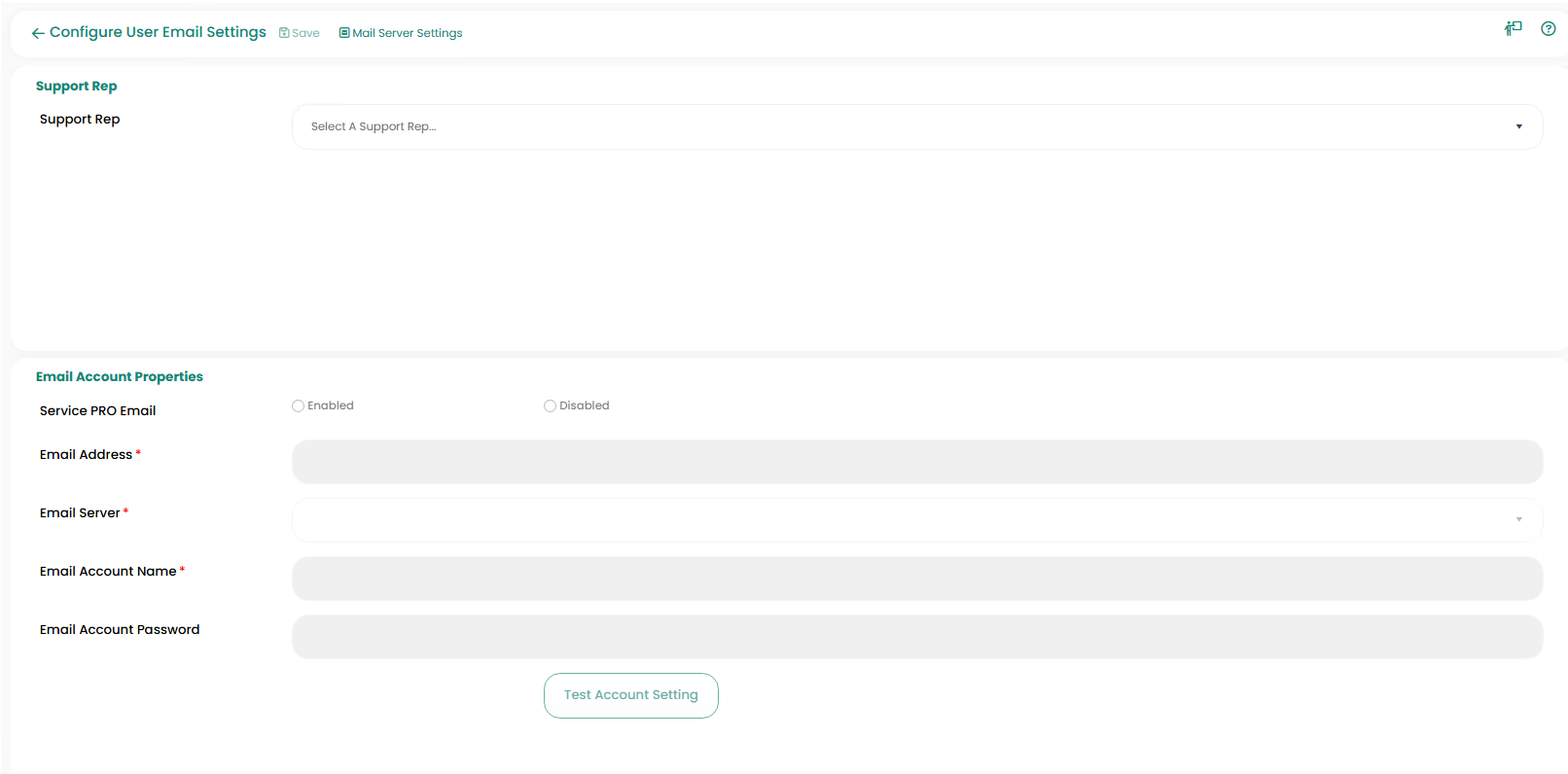 - Go to the Setup tab in the main menu and click on User Email Accounts. The Configure User Email Settings window appears as shown below.