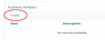 - Click on "Add+" under the Business Holidays Title to open the pop-up.