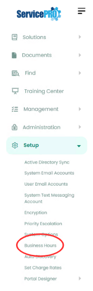 By default, ServicePRO assumes that your Help Desk is open all day, every day and will calculate intervals accordingly. However, your Help Desk’s performance will be misrepresented if the elapsed time includes days or hours when your Help Desk is closed. Use the Business Hours function to set the actual hours that your Help Desk is open. Only those hours will be used in ServicePRO’s elapsed time calculations.