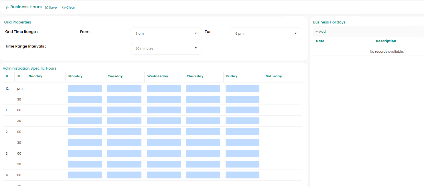 - To clear business hours, hold down the left mouse button and drag the cursor over the appropriate hours that appear in blue within the grid then release the mouse button. You can also click on the individual cells. Cleared cells appear in white.