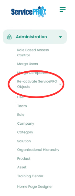 1. From the Administration tab, under Re-Activate ServicePRO Objects, Select the object you need to restore.