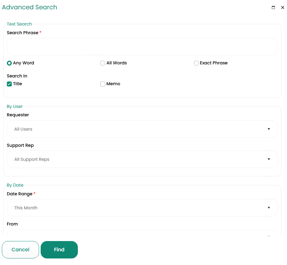 - Exact Phrase: Search for request containing the exact text entered in the search phrase field.