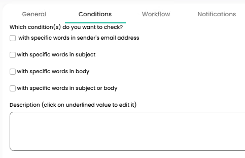 This tab helps you specify the requirements that an email must meet for a business rule to run on it.