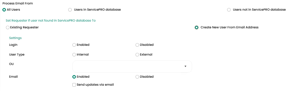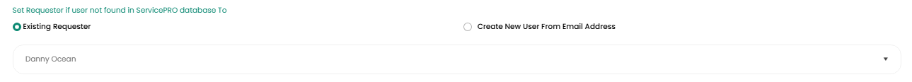 For handling email from users who are not in the ServicePRO database, you can either select an existing user as the requester (the default), or you can create new requesters based on their email addresses.