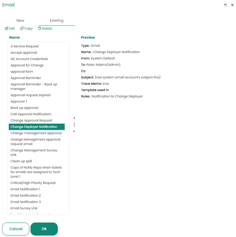 From the Email tab of Notifications, click on New. The window above opens. Select the Existing tab, which has email templates that already exist. Click on the related button to perform these tasks: