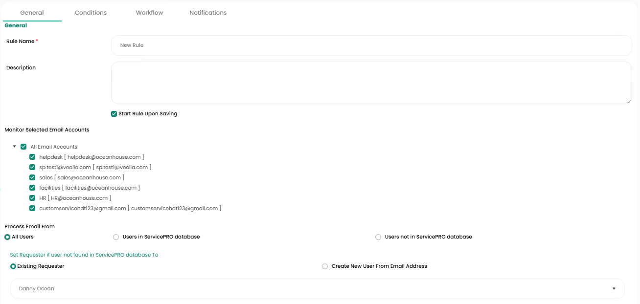 • If you click on the Existing Requester radio button, a drop-down list appears to help you select an existing user or add a new user who will become the requester. When the rule runs, for each email message received from an unknown user, the rule designer creates a service request from the requester you have selected. Note that Email must be enabled in this user’s properties.