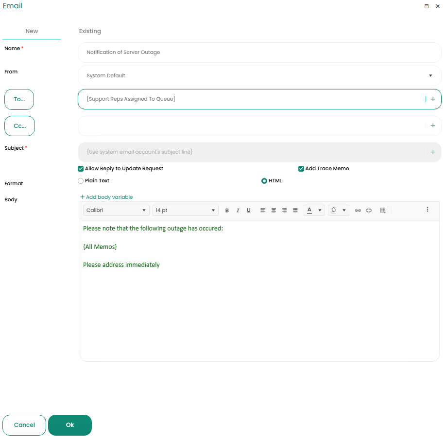 • Body – Enter the email body for this notification. Variables can also be selected in the body that will be automatically populated to referencing a specific request.