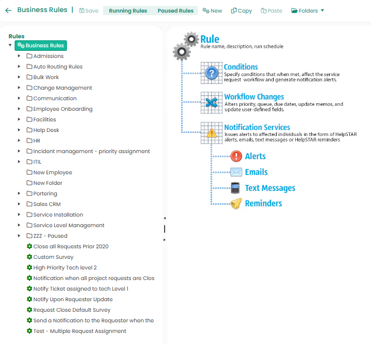 Business Rules can be used to automate standard operations and customize workflow. Business Rules actively monitor the system to identify all requests that meet a certain pre-defined criteria, after which they execute a workflow change in the request and/or send out automated notifications from it.
