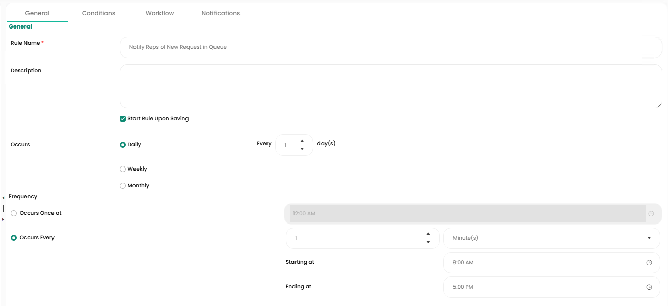 - In the Schedule work area, select how often the rule should run. The smallest increment that can be selected is 1 minute. You can also select the start and end time for the rule to run in a day based on your business hours.