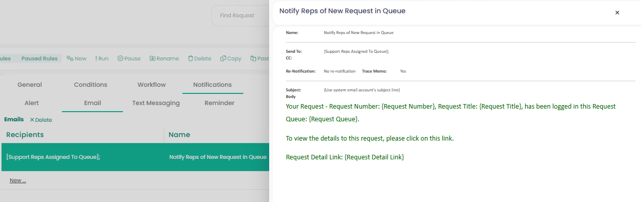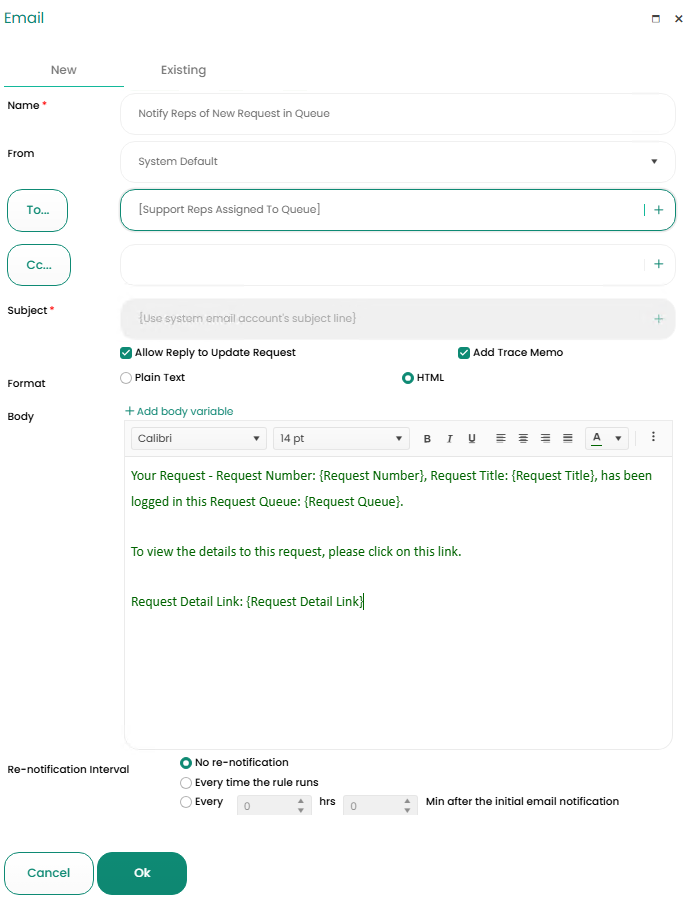 - Body – Enter the email body for this notification. Variables can also be selected in the body that will be automatically populated to referencing a specific request.