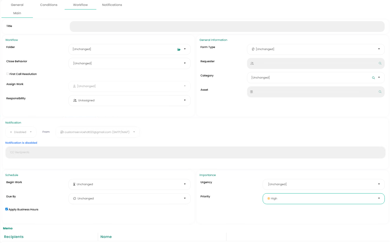 So for our scenario, if a request is moved to the desired queue, and business rules are running, that request will be updated based on the parameter values defined here. For example, if Priority is set to “High” in this tab, all request's priority will be set to "High".