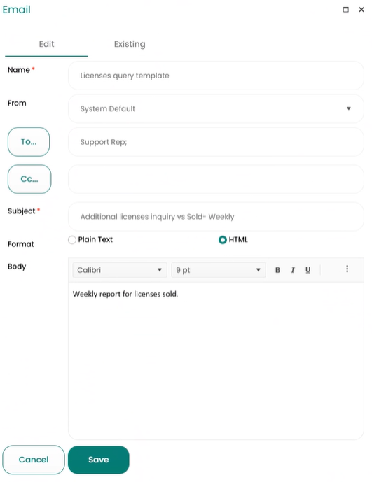 Similar to other email template fields, users can design the automated email message and select its recipients, as well as the sender of the template. The Name text field is the label used for the template.The scheduled query will be included along with the template automatically.