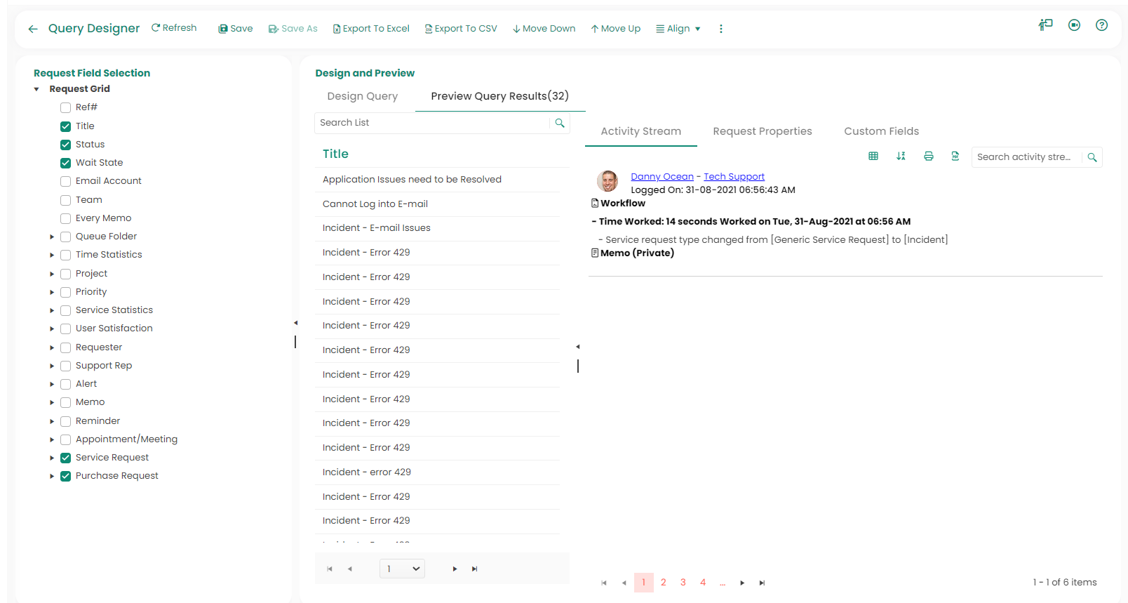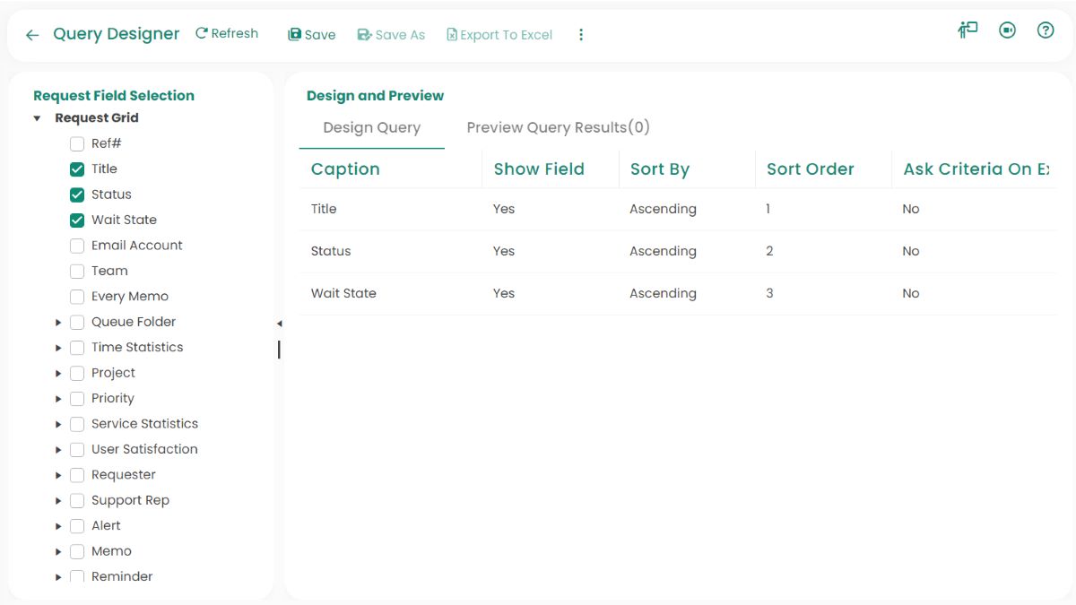 Query Designer Window Click on the “New Request Query” icon to bring up the Query Designer Window. Queries can be created to filter and view specific data about service requests. You can save queries for future use and make them available to others. The Query Designer window is shown below: