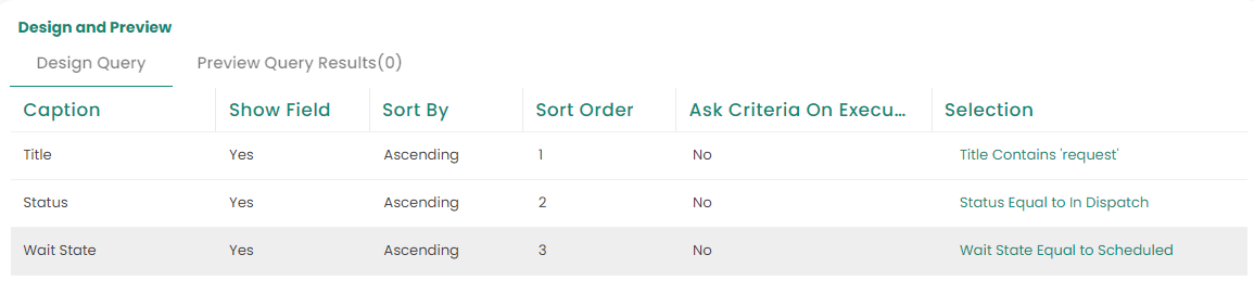 - If you chose to sort your query (in the previous step), define the sort order for each query item by entering a value in the item’s cell in the Sort Order column. For example, if you wanted to sort the query by Title then Status then Wait State you would enter a “1” in the Sort Order cell for Title, a “2” in the Sort Order cell for Status then a “3” in the Sort Order cell for Wait State.