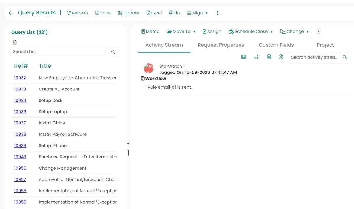 - Double-click the query you want to run or select the Run button from the Ribbon Toolbar. The results will be displayed in a list similar to that shown on the left-hand side in the image below. Double-click on a request to view its details, as shown on the right-hand side, in the image below.