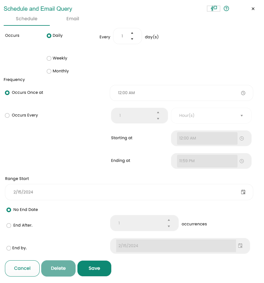 In this section, users can set up schedules and designate the occurrence, frequency, and time range when emailing a Query to other users.- Occurs - Select from Daily, Weekly, or Monthly occurrences, and how often the scheduled email is sent.