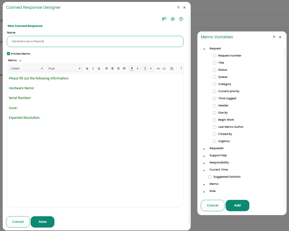 Use the Canned Responses Designer to create, edit or delete templates of predefined text that privileged users can insert into request memos and emails. The ServicePRO Administrator privilege is required to create canned responses. They can insert the template when they log or update requests by selecting the Insert Template button on the toolbar within the memo field.