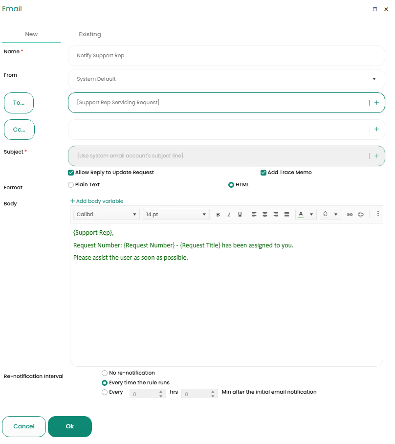 Sample 1: When a Request is Assigned to a Support Rep in ServicePRO, send a Notification to the Support Rep: