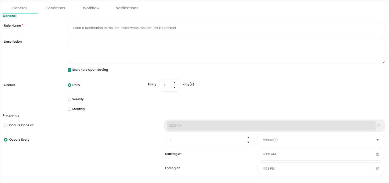 Note: Setting the Frequency to every 1 minute is not recommended for all the Business rules as priority of the Business rules are based on the Frequency.