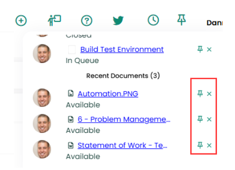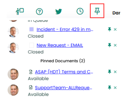 In the Recent Documents drop-down list, you can select which request you would like to add to your Pinned Documents List, by selecting the pin icon as highlighted below:Alternatively, you can chose to pin the document from the document toolbar, in the service request itself.