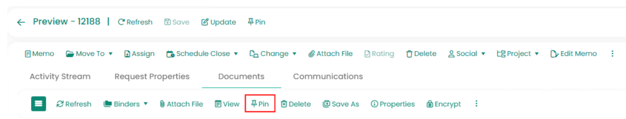 To unpin recent documents, navigate to the Pinned Items and click on the pin icon to the right of the request title.You can also select Unpin from the Document tab of a Service Request. by selecting the unpin icon from the documents toolbar as shown below: