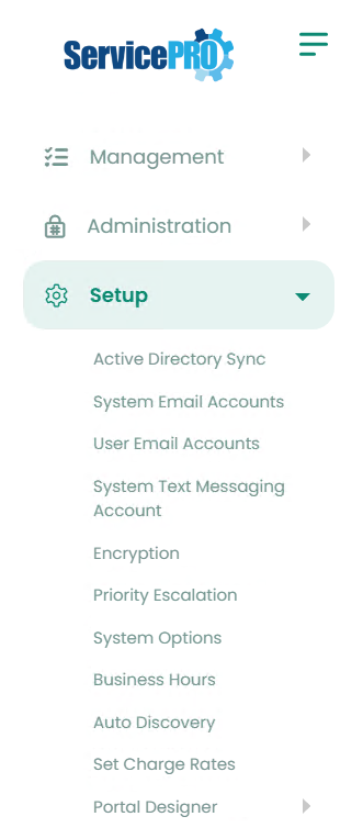 To configure ServicePRO, open the ServicePRO menu, and select the Setup tab.