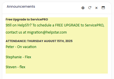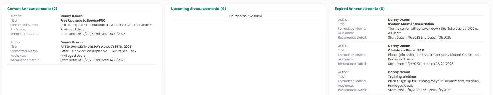 - Upcoming Announcements – Announcements set to appear in a future date (done via New/Edit Announcements’ Date fields) are shown here.