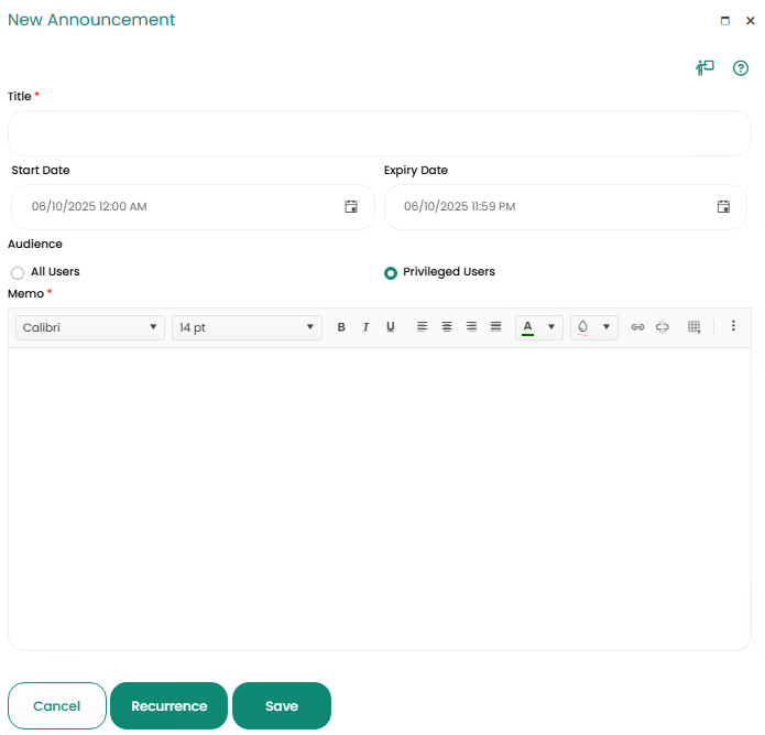 Clicking the New icon in the ribbon toolbar opens the New Announcements window, allowing you to set the following options: