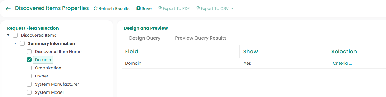 Select the Query Designer to open the Discovered Items Property window from the Auto Discovery Tab. Here you can create a specific Query for assets to be discovered.