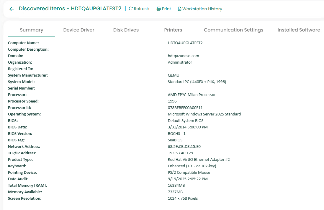 Select the Current Workstation icon to run an audit on at the workstation where you are currently logged in. This audit identifies and displays all hardware and software currently installed on your workstation.When the audit completes, the Discovered Items window appears, as shown below, displaying the audit results for your machine. The following information is provided in these results: