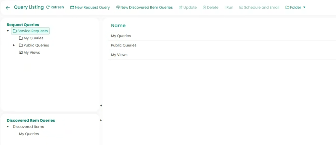 From the Assets/Configuration page, go to the Auto Discovery task group and click on the My Queries icon to open the Query Listing window, as shown below. This window helps you create new, run, update, or delete an existing discovered item query.