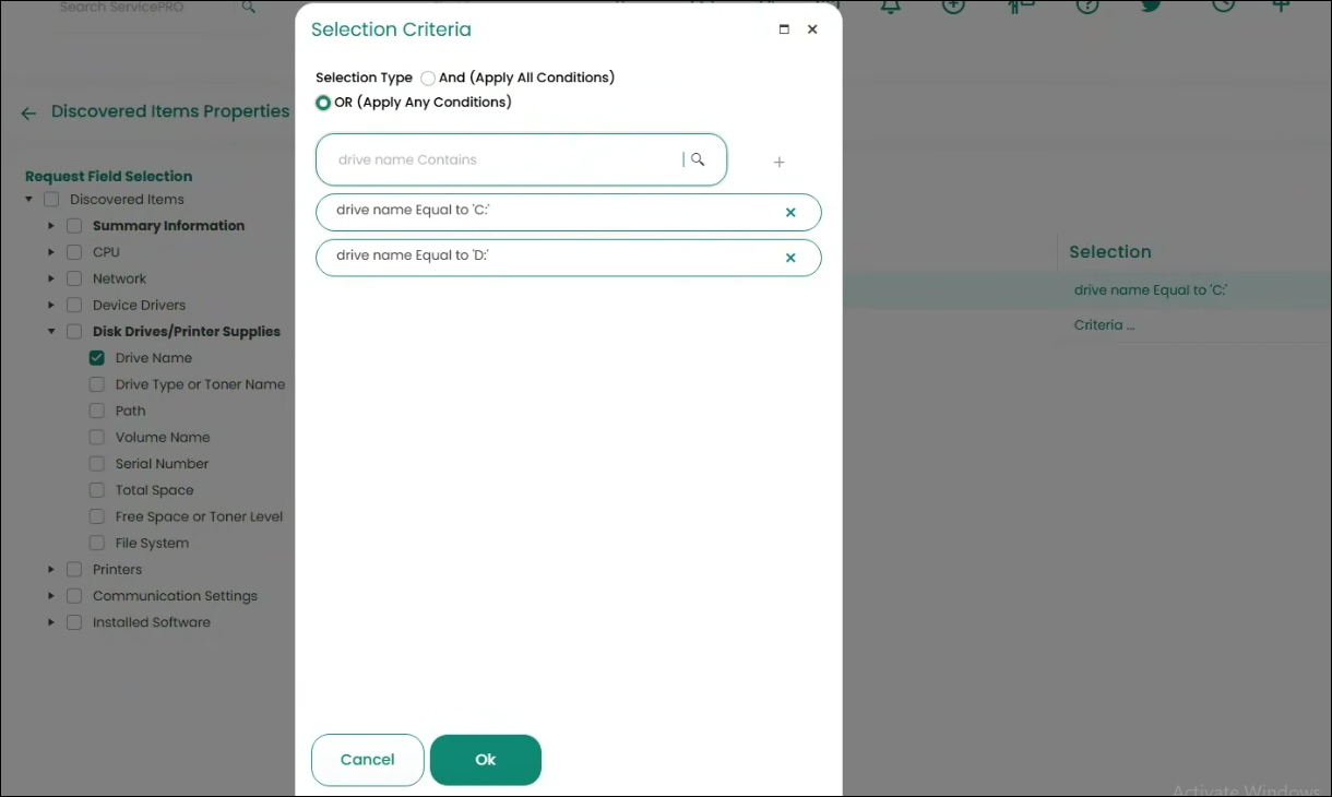 Query Designer - In the Selection Type work area, click on the And or Or radio button to select the operator you want to use to combine your search strings. In the example in the figure above, the query will find all the Drives with the name “C:” OR “D:”