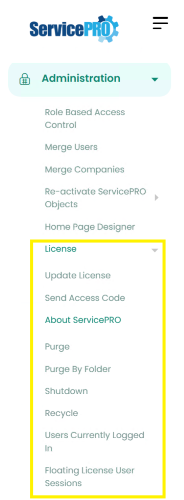 An XML containing licenses will be sent from ServicePRO Customer Service via email. License installation instructions will be contained within that email. From the Administration tab, go to the License task group and click on Update License. Follow the instructions received via email to successfully install the license.About ServicePRO