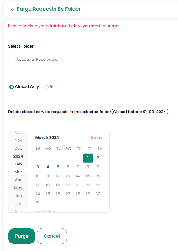- Select the Date in which you want to Purge the Folder, then press Purge.