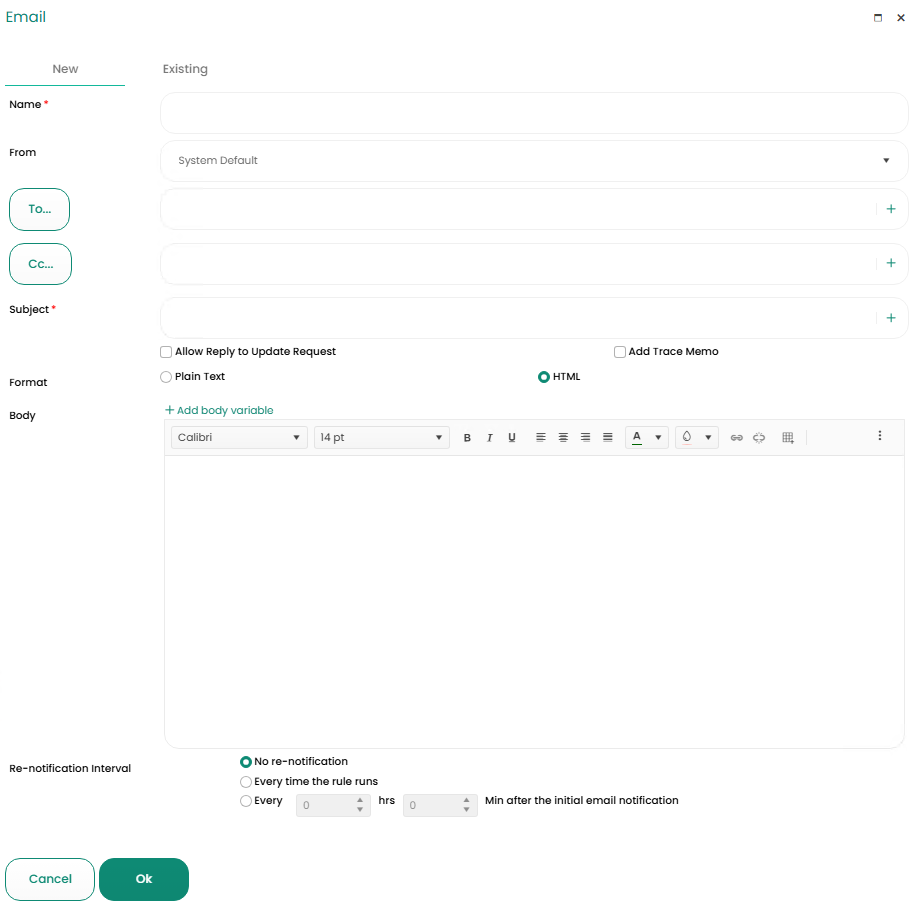 Using this tab, you can configure a new email notification.- Name – Enter a name for the Email Template, this will not be included in the message sent.