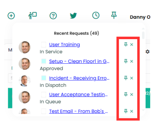 In the Recent Request drop-down list, you can select which request you would like to add to your Pinned Request List, by selecting the pin icon as highlighted below: