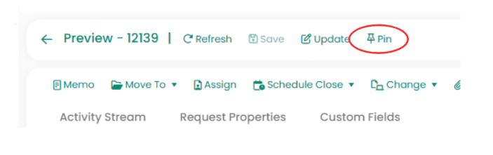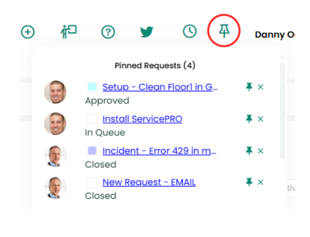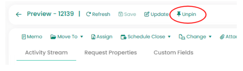 To unpin recent requests, navigate to the Pinned Items and click on the pin icon to the right of the request title.You can also click on the request from the list, and unpin it from the request window as shown below: