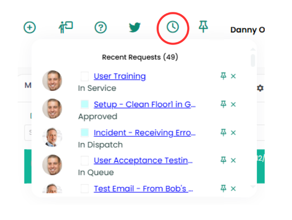 To access Recent Requests, navigate to the main toolbar at the top of the screen, and select the Recent Items icon, as circled below: