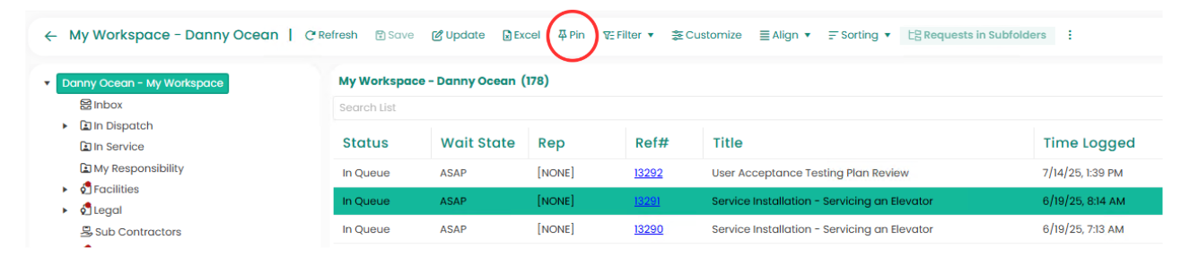 Requests can be pinned and unpinned from this listing, or also by clicking on a request from the Workspace listing, and selecting the pin option in the My Workspace toolbar.If an item is Pinned, and subsequently Unpinned, then it will be placed at the top of the Unpinned items listing.