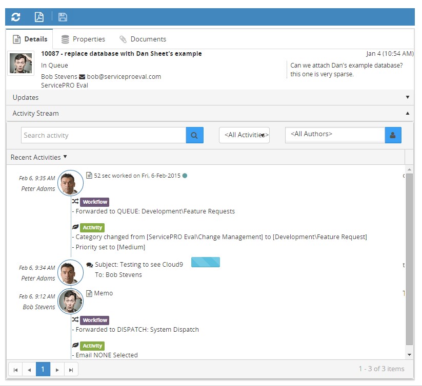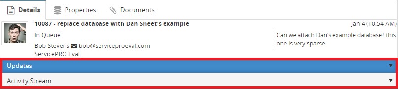 In the Details tab, Users can add updates via memos and view the activity stream for that message’s associated request. Updates and Activity Stream can be accessed by opening their respective panes below the Message.