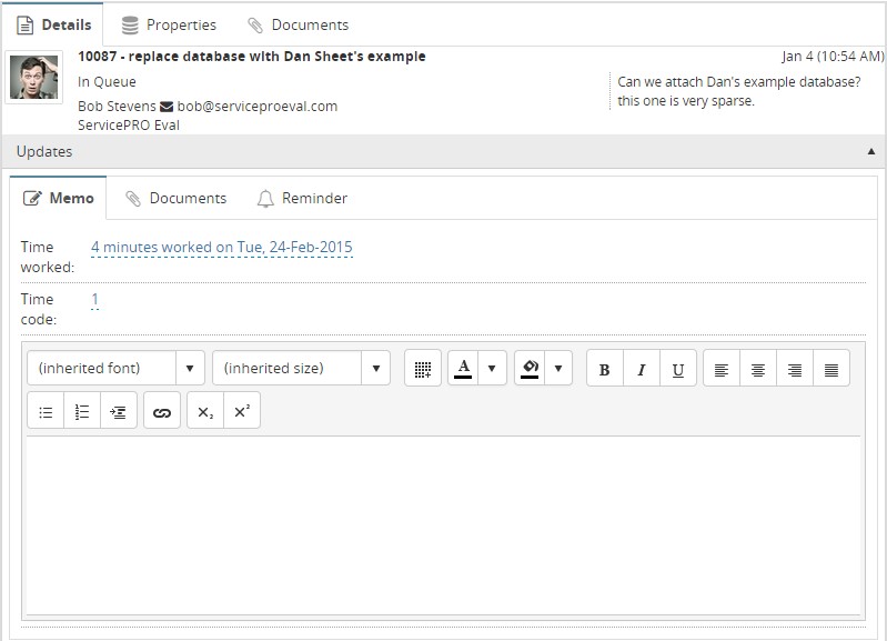Users may update requests directly from the Message interface pane. Selecting the Updates bar will drop open a Memo field.