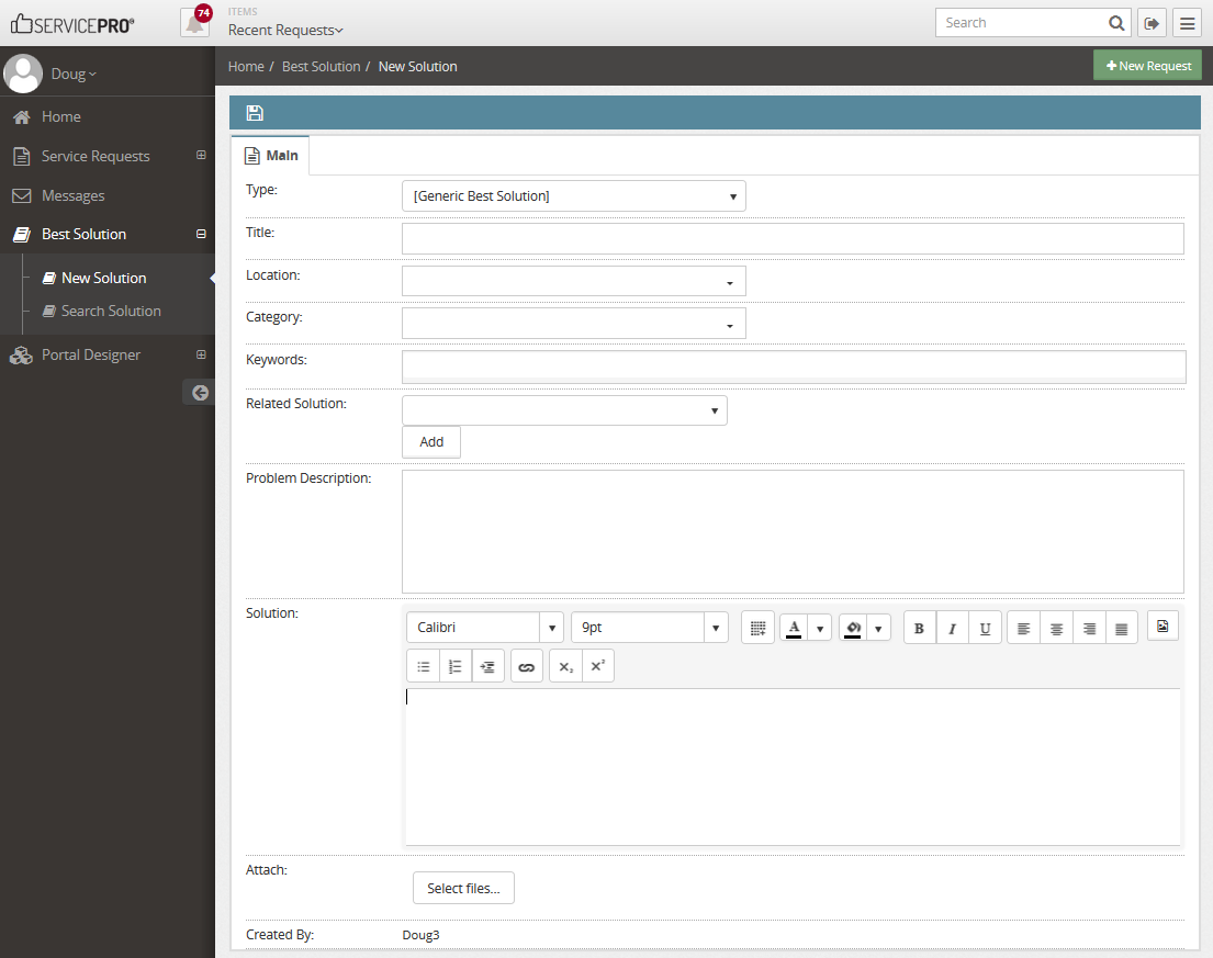 When privileged users close requests in ServicePRO Web, they can also choose to create a Best Solution for the resolution of the request. This can be done by closing the request while updating it, then selecting the Solutions (Book) icon from the header in the request details pane on the right. Users will be brought to the New Solutions page, and will be allowed to create a solution associated with the request. Some information from the request will already be included.